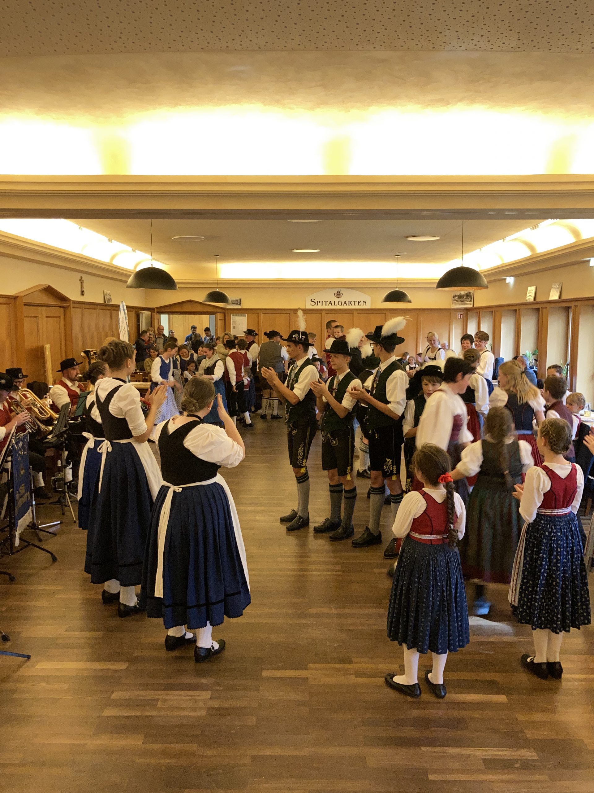 Unter dem Motto „A Liedl, a Muse und a Tanzl“ traf sich am Sonntag, 19.10.25 die Regensburger Trachtenjugend, bestehend aus den Trachtenvereinen Almrausch Stamm, Alpiner Verein und Regensburg Stamm. Der Tag begann am Vormittag mit einem gemeinsamen Gottesdienst in der Pfarrkirche St. Konrad unter musikalischer Umrahmung der Trachtenkapelle vom Trachtenverein Regensburg Stamm. In der Mittagspause ließen es sich die Kinder und Erwachsenen mit Käsespätzle, Schnitzel und Schweinebraten gut gehen, ehe das Programm im Spitalgarten begann.