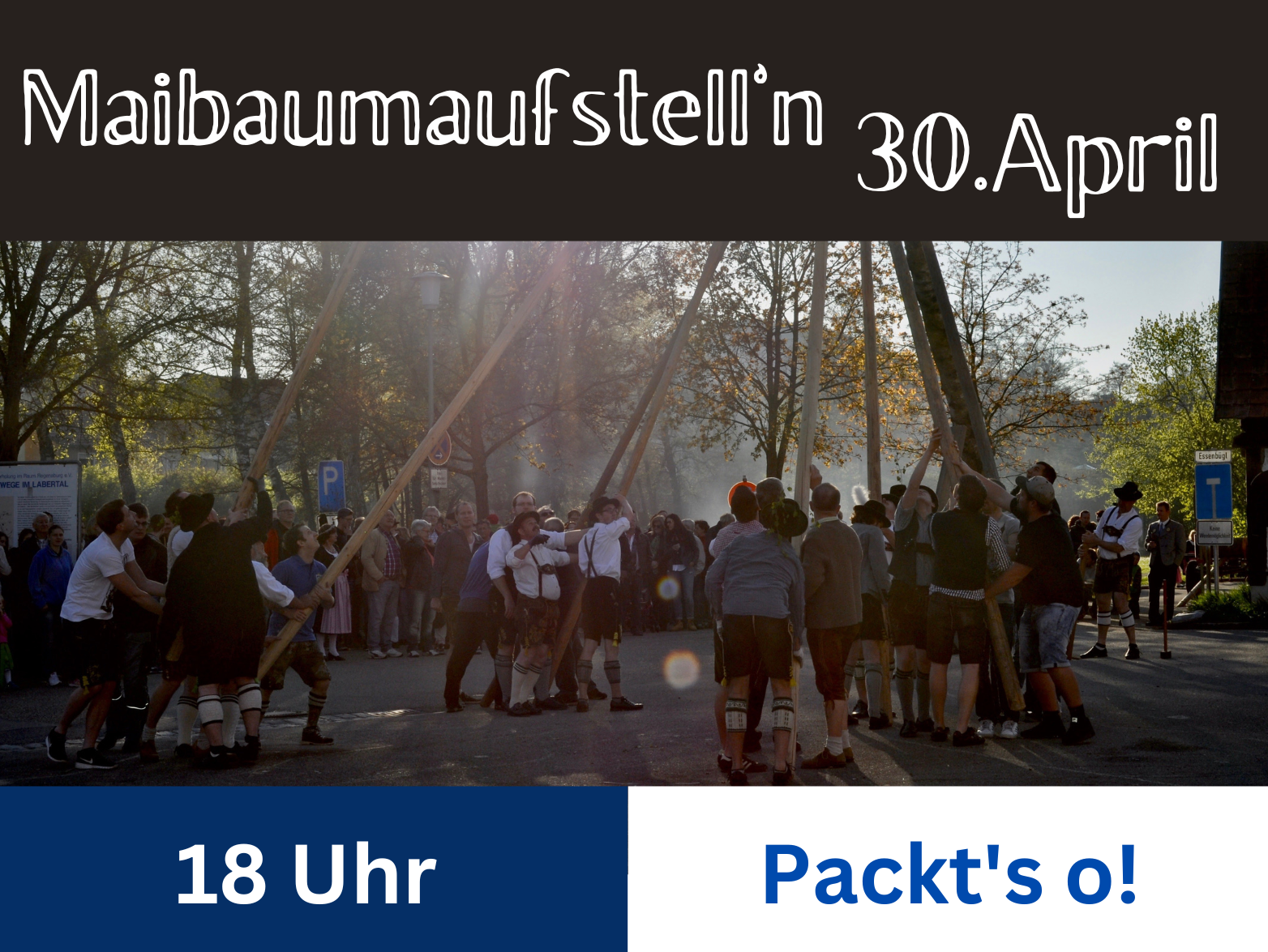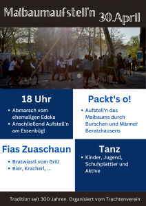 Da der Maibaum mit Manneskraft aufgestellt wird, sind kräftige Burschen herzlich willkommen, um beim Aufstellen zu helfen. Recht herzliche Einladung ergeht an die gesamte Bevölkerung der Großgemeinde, dem Maibaumaufstellen beizuwohnen. Für das leibliche Wohl ist bestens gesorgt, es gibt traditionell wieder Bratwurstsemmeln, Bier und nichtalkoholische Getränke wie Wasser, Limo und Apfelschorle. Der Verkaufserlös wird ausschließlich für die Jugendarbeit im Verein verwendet.