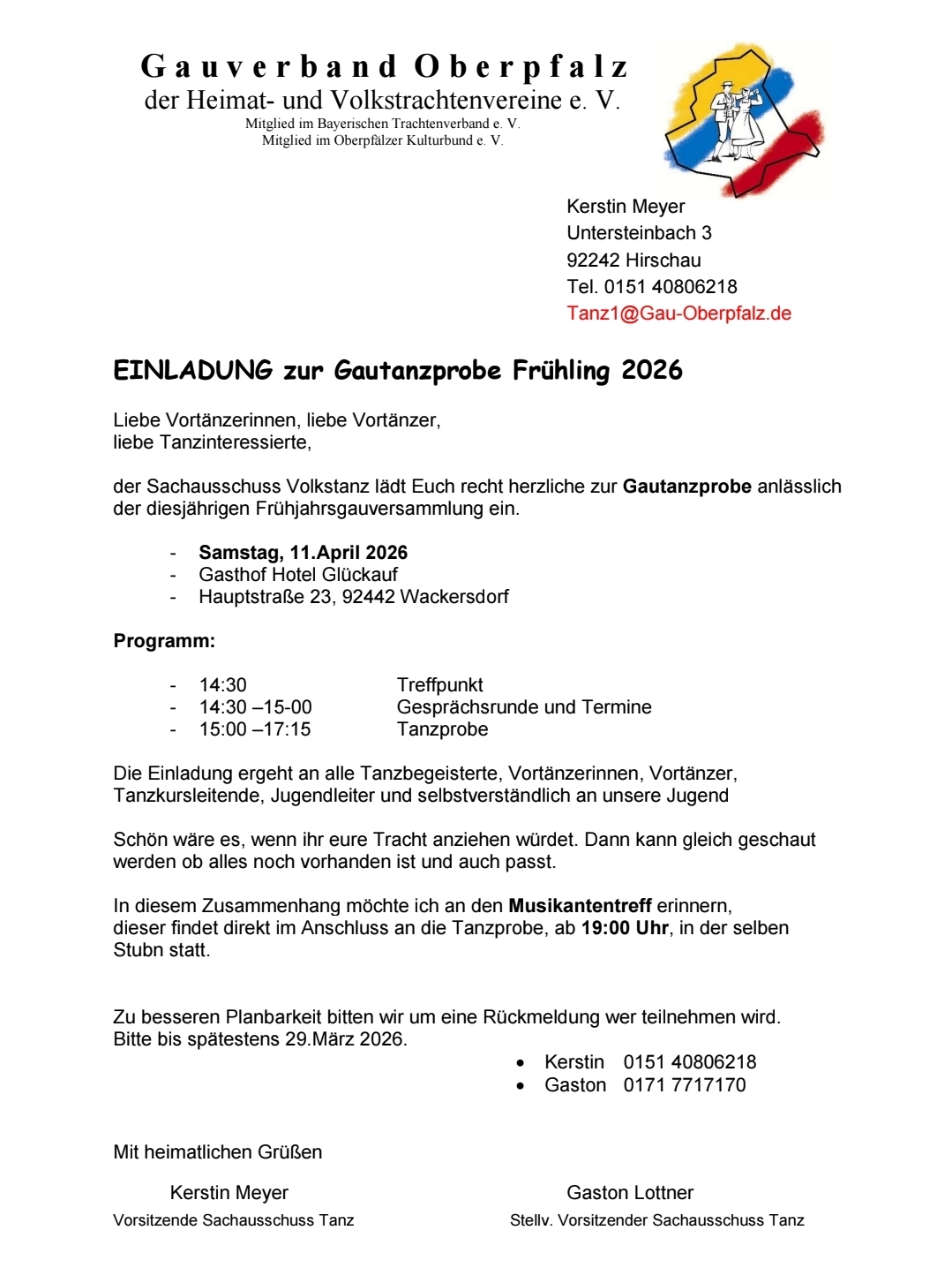 Der Sachausschuss Volkstanz des Oberpfälzer Gauverbands lädt anlässlich der diesjährigen Frühjahrsversammlung recht herzlich zur Gautanzprobe ein.