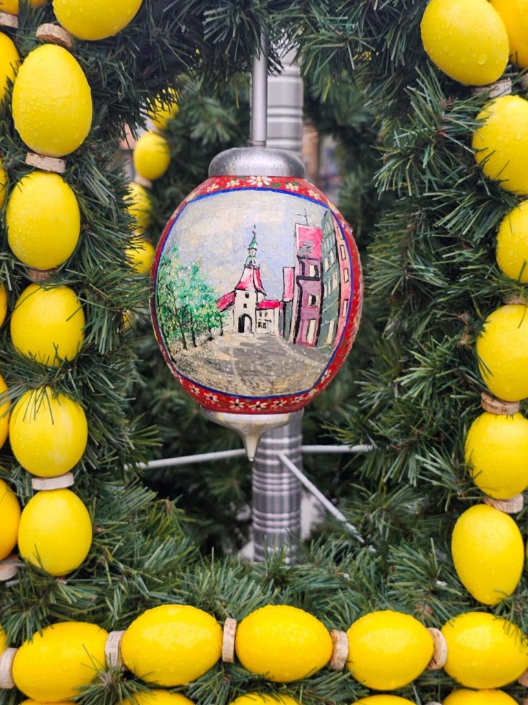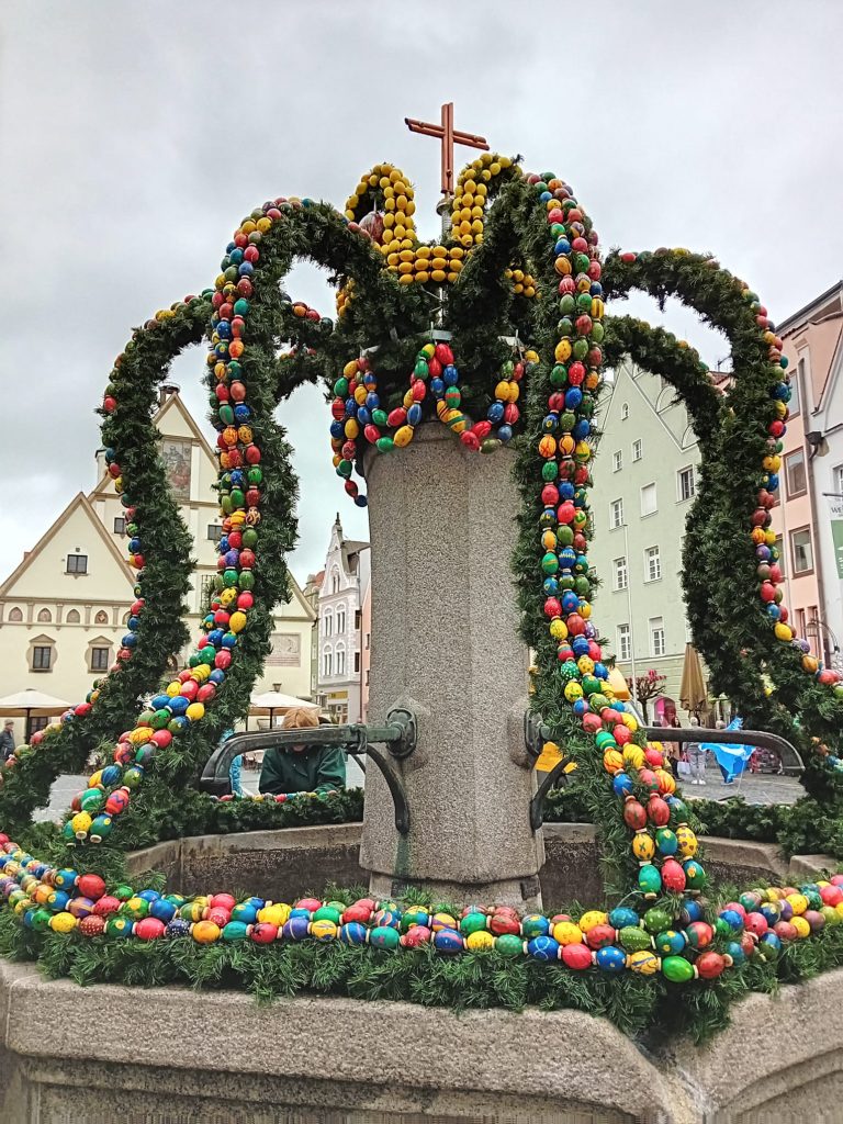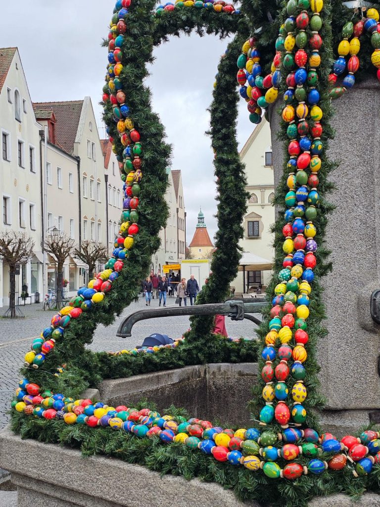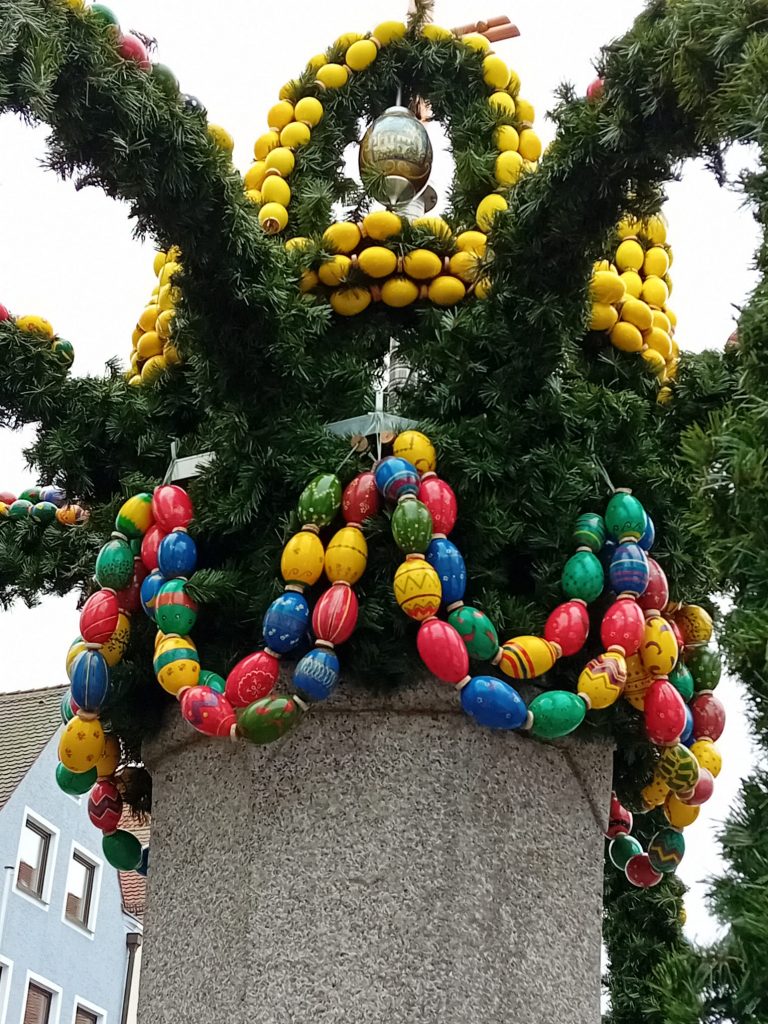 Alles begann hier mit dem Wunsch einer älteren Dame, die den schönen Brunnen am Markt gerne geschmückt sehen wollte. Es wurde von zwei Spenglern ein Gerüst für die Girlanden gebaut, die Straußen-Eier wurden von einem Künstler bemalt. Die restlichen Frauen haben in verschiedenen Wohnung, Vereinsheimen mit Groß und Klein die anderen Eier gemalt. Der damalige Heimatringsvorsitzende hat dann alles finalisiert.