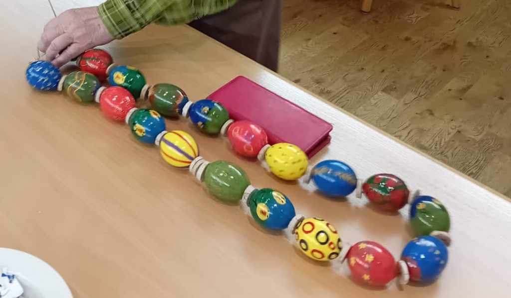 Drei Tage vor dem Aufbau der Krone werden die Eier zur Girlande auf festen Bast gefädelt: eine Korkscheibe, ein Ei, usw.