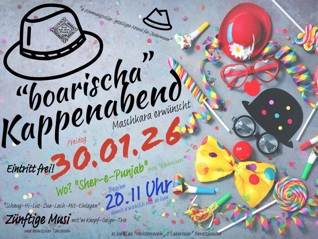 Der Heimat- und Volkstrachtenverein „D’Labertaler“ Beratzhausen lädt ein zum „boarischen“ Kappenabend im „Sher-e-Punjab“ (ehemals Gasthaus Mosner) Freitag 30.01.2026, Einlass ab 19:00Uhr, Beginn 20:11Uhr, damit a olle dosan. Ein geselliger Abend […]