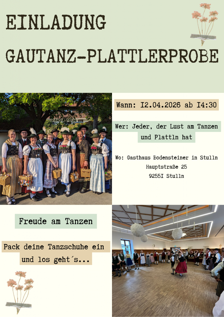 Liebe Trachtenkameradinnen und Trachtenkameraden, wir laden euch herzlich ein zur Gautanz- und Plattlerprobe am Sonntag, den 18. Mai 2025, ab 14:30 Uhr in Bruck i. OPf. im Meiselsaal. Kommen darf […]