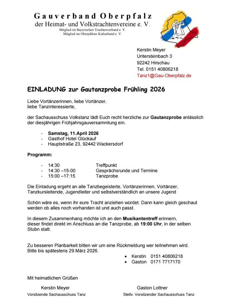 Der Sachausschuss Volkstanz des Oberpfälzer Gauverbands lädt anlässlich der diesjährigen Frühjahrsversammlung recht herzlich zur Gautanzprobe ein. Wann: Samstag: 11.April 2026 ab 14:30 Uhr Wo: Gasthof Hotel Glückauf, Hauptstraße 23, 92442 […]
